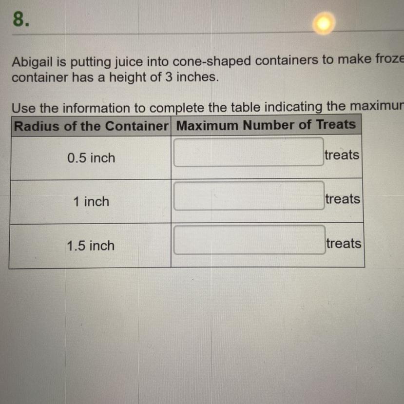 Maximum number of treats = amount of juice (58 in³) ÷ volume of cone-shaped container to be used