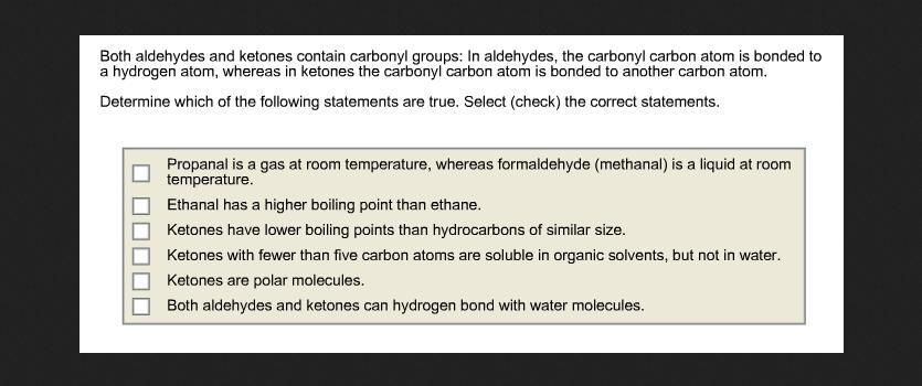 This option is incorrect because the polar carbon-to-oxygen double bond causes aldehydes and ketones to have higher boiling points than those of ethers and alkanes of similar molar masses.