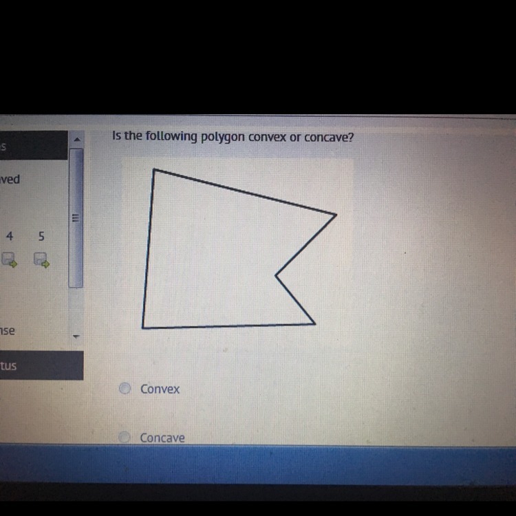 Concave. It is possible to draw a line segment joining two interior points that goes outside the polygon.