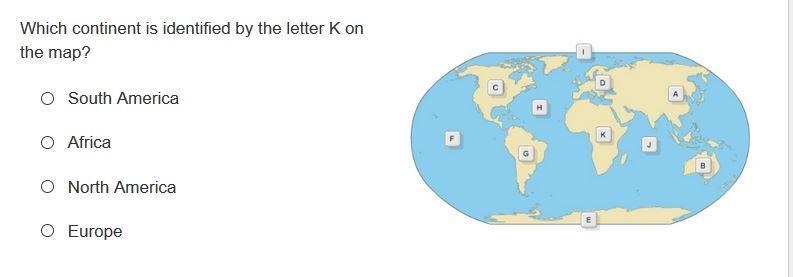 The continent marked with the letter K is Africa.