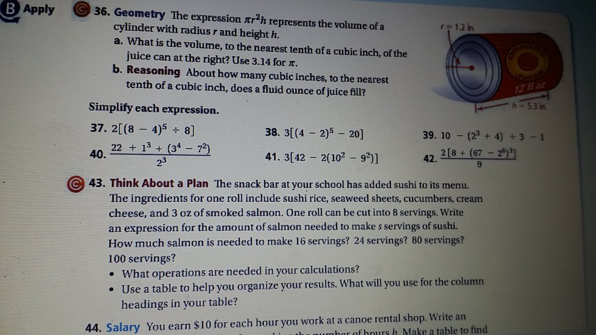 38) -first you have to subtract 4-2=2 -then solve for 2^5=32 -subtract 32-20=12 -and finally multiply 12*3=36 40) -you have to solve for the numerator and denominator first -the denominator is simple because you just have to do 2^3 which is 8 -to solve for the numerator you have to do what's in the parentheses first (3^4-7^2) which gives you 32 -the equation you should have now is 22+1^3+32 all divided by 8 -1^3 just equals 1and then you just solve for the numerator -to solve for the numerator you have to add 22+1+32 which gives you 55 as the numerator -since 55 cannot be divided by 8, your answer will be 55/8 or 6.875 42) -first you have to solve for the parentheses in the brackets so solve for (67-2^6) which equals to 3 -now your numerator should look like this: 2[8+(3)^3] -you have to solve for 3^3 which is 27 -now you solve what you have left in the brackets [8+27] =35 -multiply 2*35 which gives you 70 -70 cannot be divided by 9 so your answer is 70/9 or 7.777777778