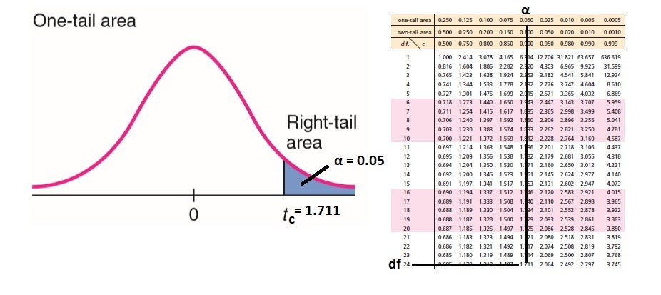 By using the t table attached here , Look for the corresponding t critical value for df = 24 and α = 0.05 in one tailed area.