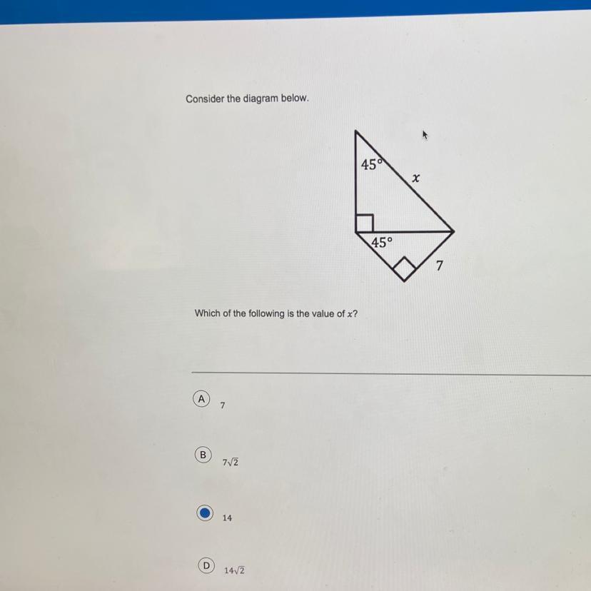 Therefore the two sides are 7 and 7 of small triangle, so By Pythagoras theorem the third side is