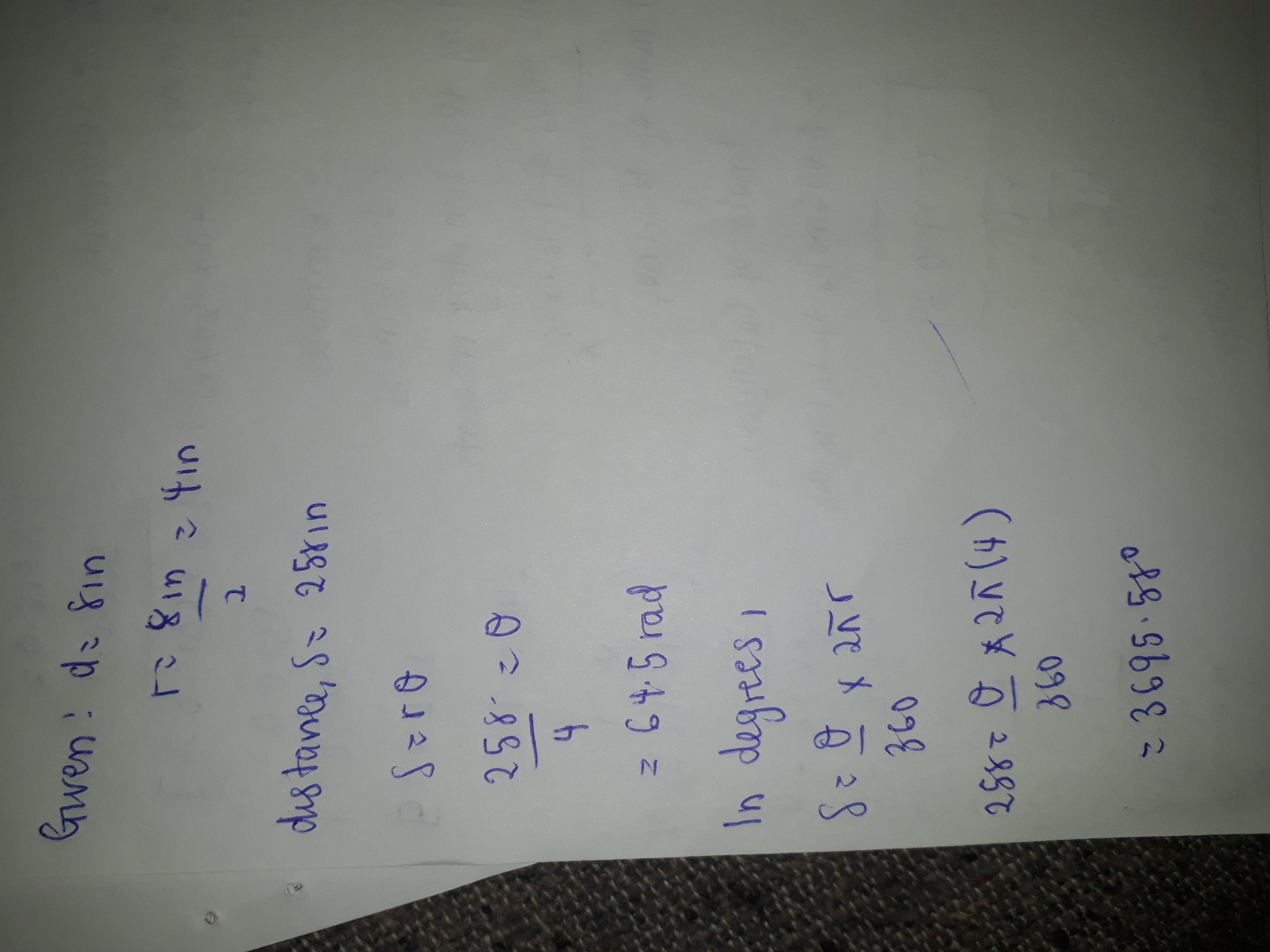 A peach pie in a 8.00 in diameter plate is placed upon a rotating tray. Then, the tray is rotated such that the rim of the pie p late moves through a distance of 258 in. Express the angular distance that the pie plate has moved through in revolutions, radians, and degrees.