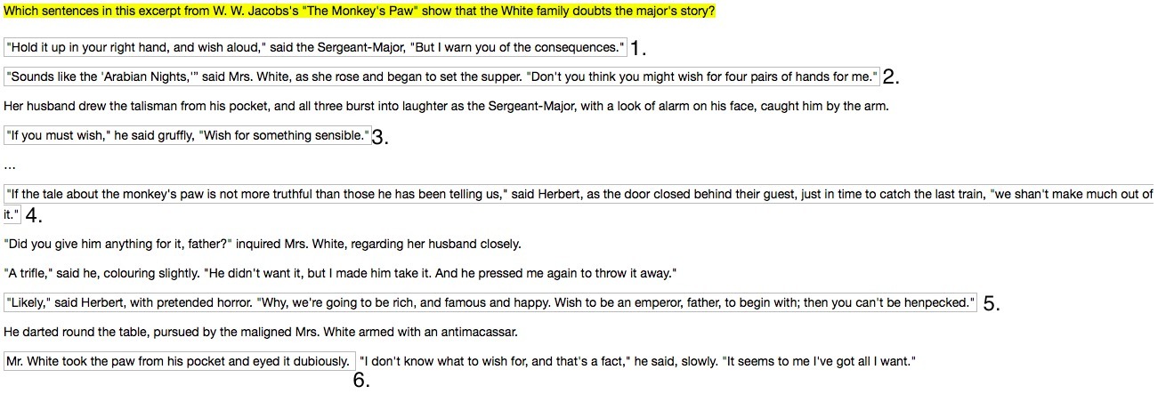 As for which ones to choose, likely 5 and 6 would be about your best bet. Mrs. White has a very sharp tongue and she and Herbert are the most questioning. Four tells us how Herbert privately assesses the Sergeant Major. He is very questioning as is Mrs. White. So take your pick of 2,4,5 and 6