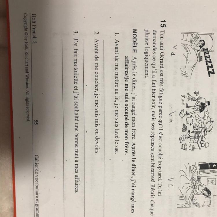 <em>3. J'ai fait ma toilette et j ai souhaitéune bonne nuit à mon frère/ j'ai rangé mes affaires.</em>