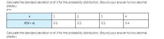 PRACTICE ANOTHER Calculate the standard deviation σ of X for the probability distribution. (Round your answer to two decimal pla