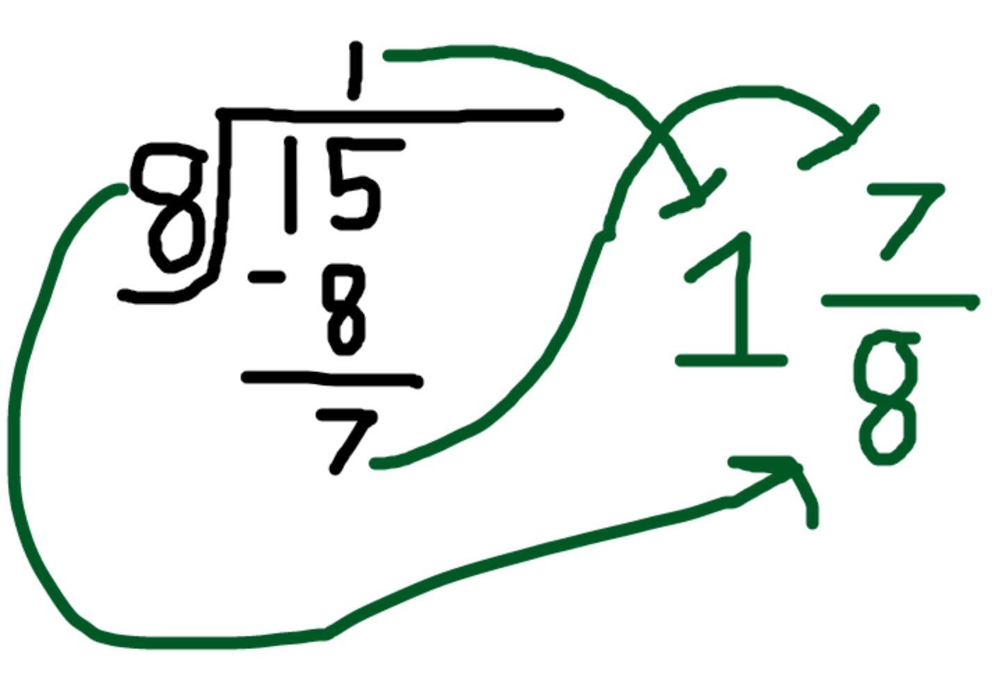 Since 15/8 is an improper fraction, we can change this to a mixed number by dividing the denominator into the numerator.