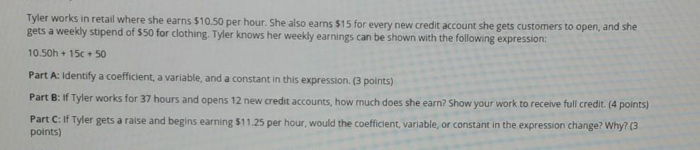 The variables are simply letters. They are placeholders for numbers to be plugged in later. Think of them like empty boxes where numbers will go. In this case, the variable h represents the number of hours Tyler works, and c is the number of new accounts she opens.
