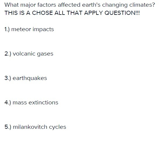 <h2>Answer : Meteor impacts, Volcanic gases, and Milankovitch cycles.</h2><h3>Explanation : </h3>