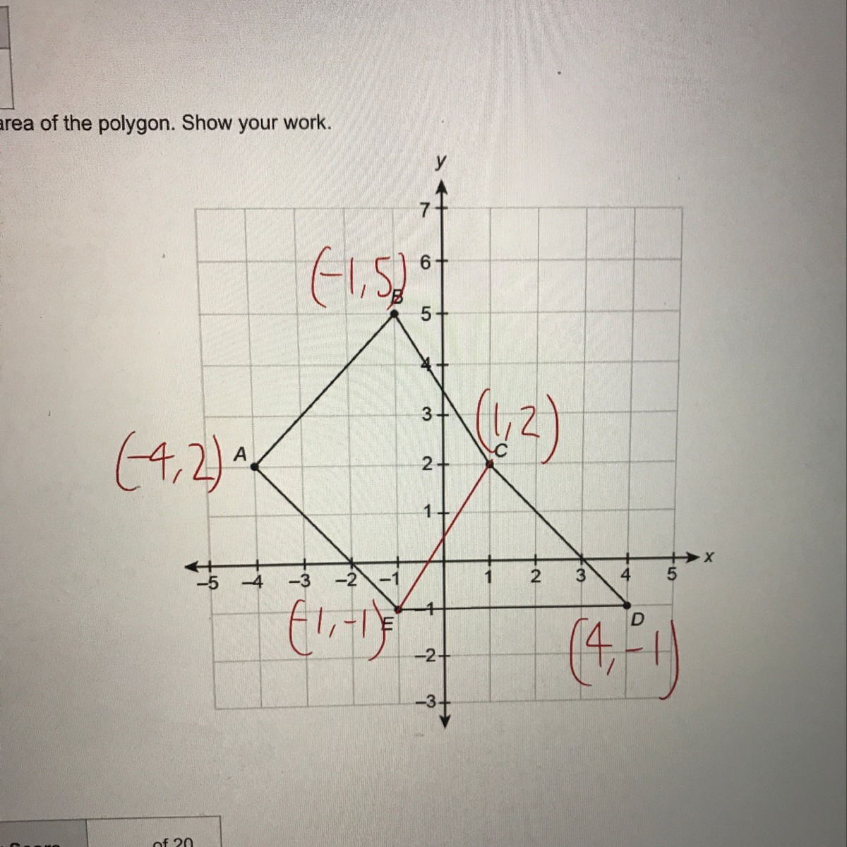 So with this polygon, you'll gonna break it into 3 triangles: BAE, BCE, and CED. (youll need to make line BE.). After that, youre gonna find the area of each of the triangles and then add the areas all up.