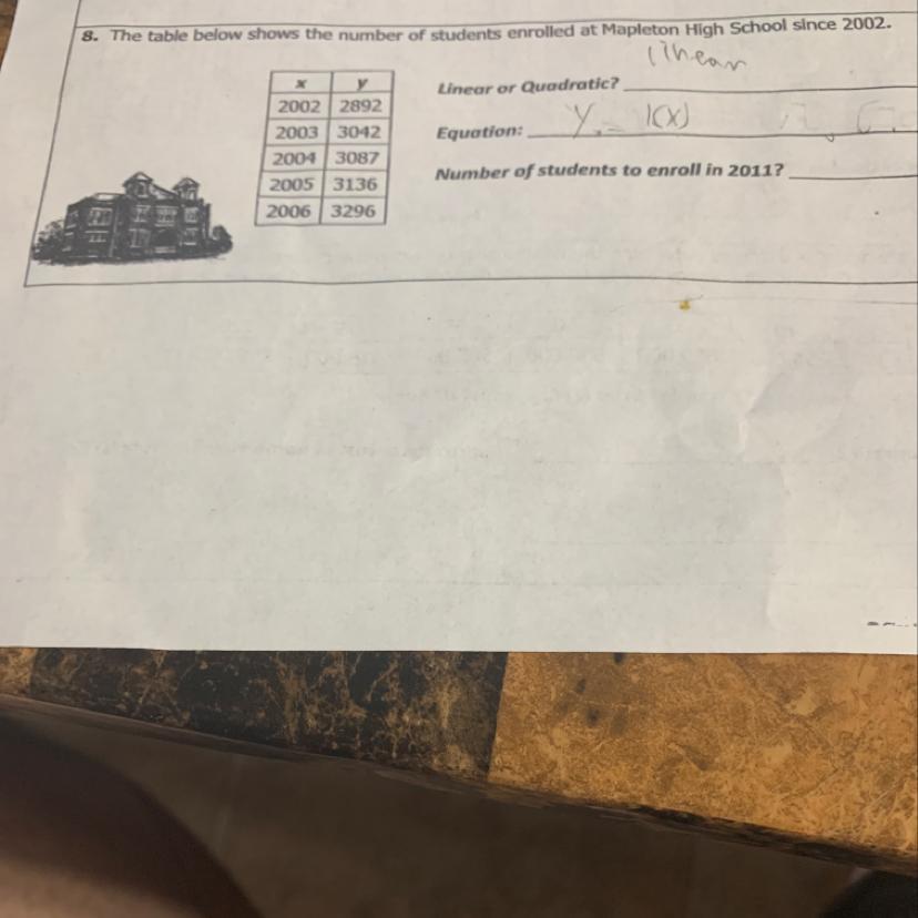 Linear is a straight line. Quadratic is a square which generates parabola. Quadratic formula is (ax)^2 + bx + c = 0. Linear formula is ax+bx + c = 0 To forecast time series data modelling can be used. To form a linear equation y = mx + c. After finding x is the required value , m is the intercept and C constant. X axis have years and Y axis has the value. To find number of students x is 90.2 * 2011 - 177670. The result comes to 3722. In Data analysis predictive modeling is the second phase. It is important because it helps in associating to variables.