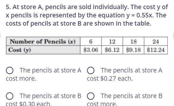 at store A, pencils are sold on individually. The cost y of x pencils is represented by the equation y = 0.55x. The costs of pen
