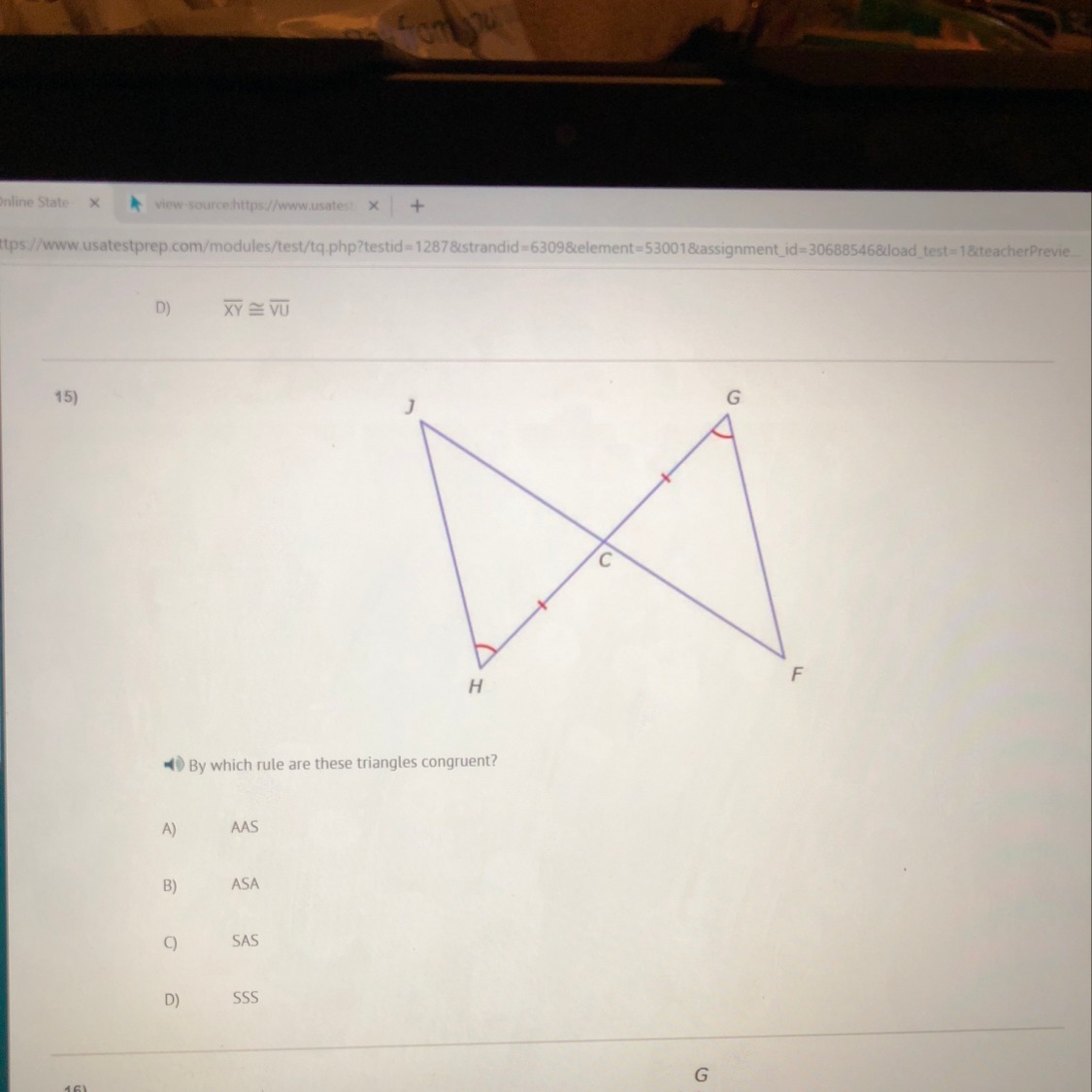 Solution: It is given that ∠JHC is congruent to ∠FGC, HC=CG, thus