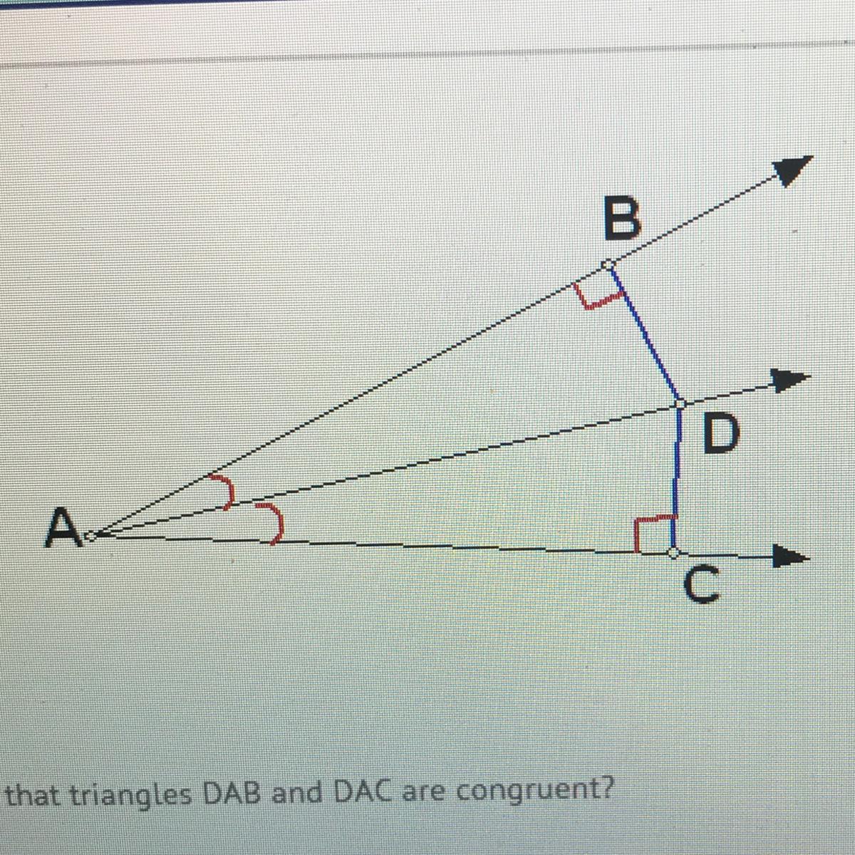 You can get <ADB = <ADC because every triangle has 180 degrees. You know two of the angles: you can show that the 3 rd set are equal a subtraction postulate.