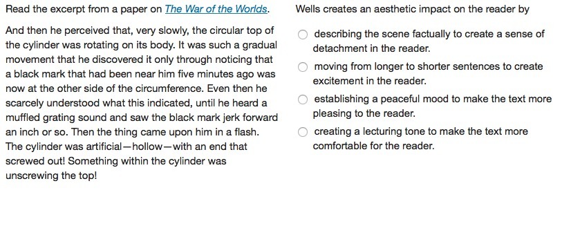 Wells starts this passage with long, descriptive sentences, that later on are changed for others much shorter and concise.