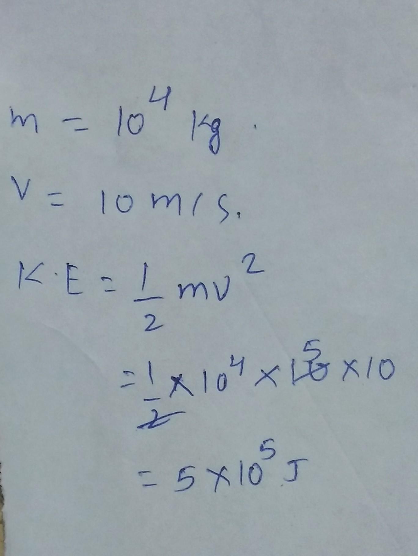 1) A pile driver with mass 1x10⁴ kg strikes a pile with velocity 10.0 m/s. What is the kinetic energy of the driver as it strike
