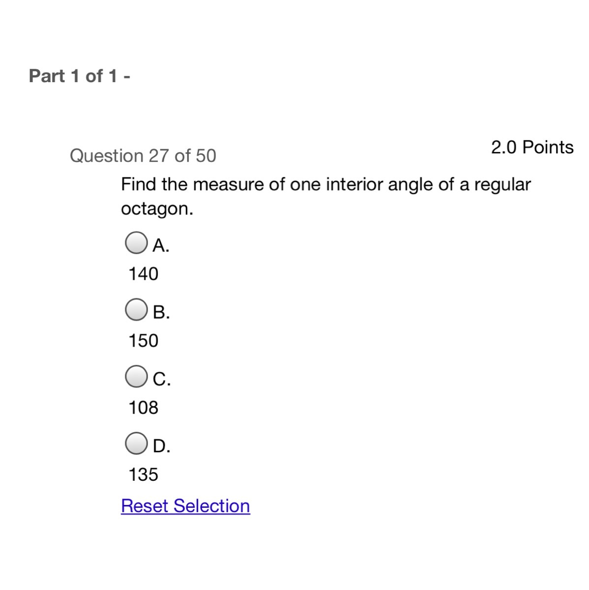 We have got the required answer here. The measure of one interior angle of regular octagon is