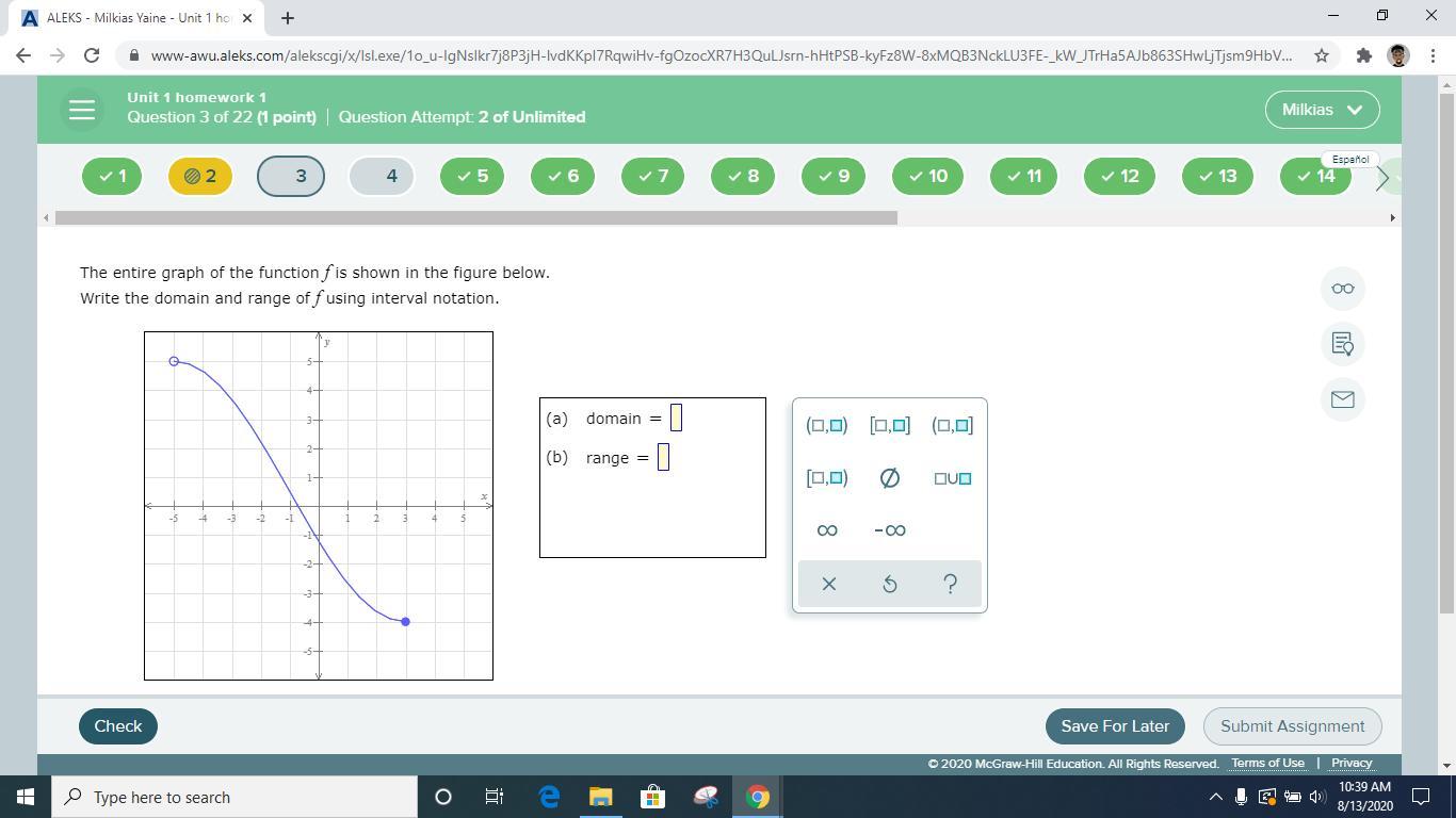 The domain is the set of allowed x values. In terms of a graph, we look at the left most point to see that x = -5 is the smallest x value possible. However, there's an open hole at this endpoint, so -5 itself is actually not part of the domain. So x must be larger than -5. At the same time, x can be as large as x = 3. Look at the very right tip of the graph to find this x value.