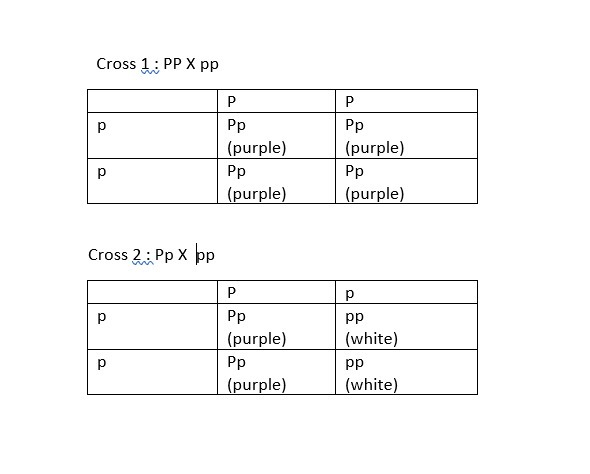 The phenotype of all the offspring in the cross 1 is Purple, and the genotype is pp. Hence, the possibility of getting purple flowers in the progeny is 100%.