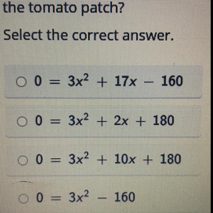 If the area of the vegetable garden is 170 square feet, which equation could be used to find the length of the tomato patch?