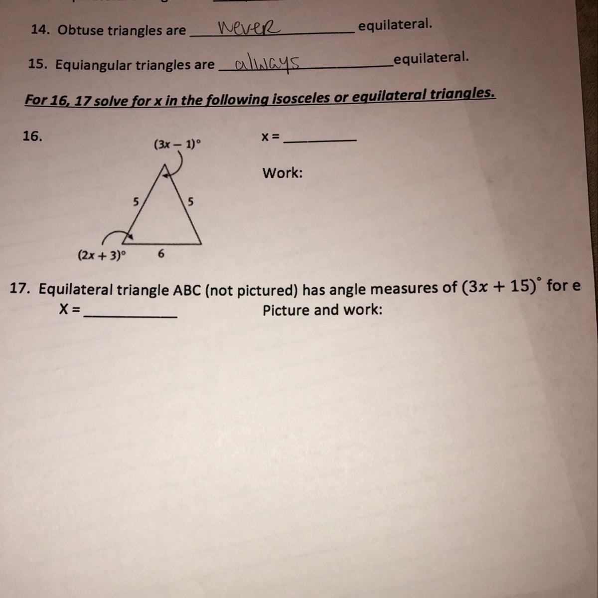 Question 16 ) x = 15 { for an Equilateral Triangle}