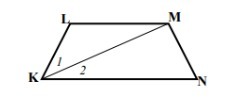 KM is a transversal relative to parallel lines LM and KN. Thus ∠2 = ∠MKN ≅ ∠KML and ∠KML = ∠1. The two base angles of ΔKLM are equal, so that triangle is isosceles.