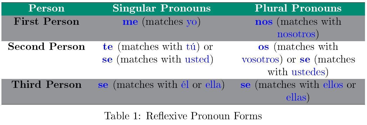 se (yourselves, themselves). If the object of the verb is the same entity as the subject, you'll need to use a reflexive pronoun that matches the subject of the verb in both number (singular or plural) and person (first, second, or third). In Table 1 (below), you willl find the different forms Spanish reflexive pronouns take.