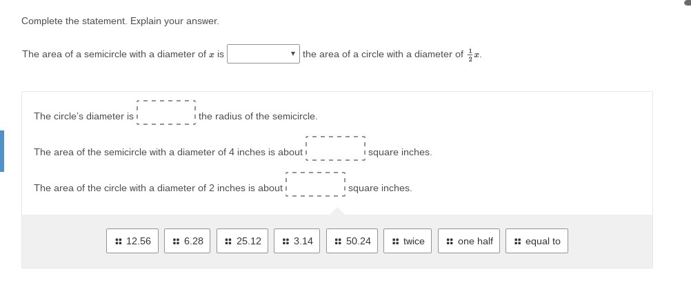 The area of a semicircle with a diameter of x is <u>half</u> the area of a circle with a diameter of \frac{1}{2}x