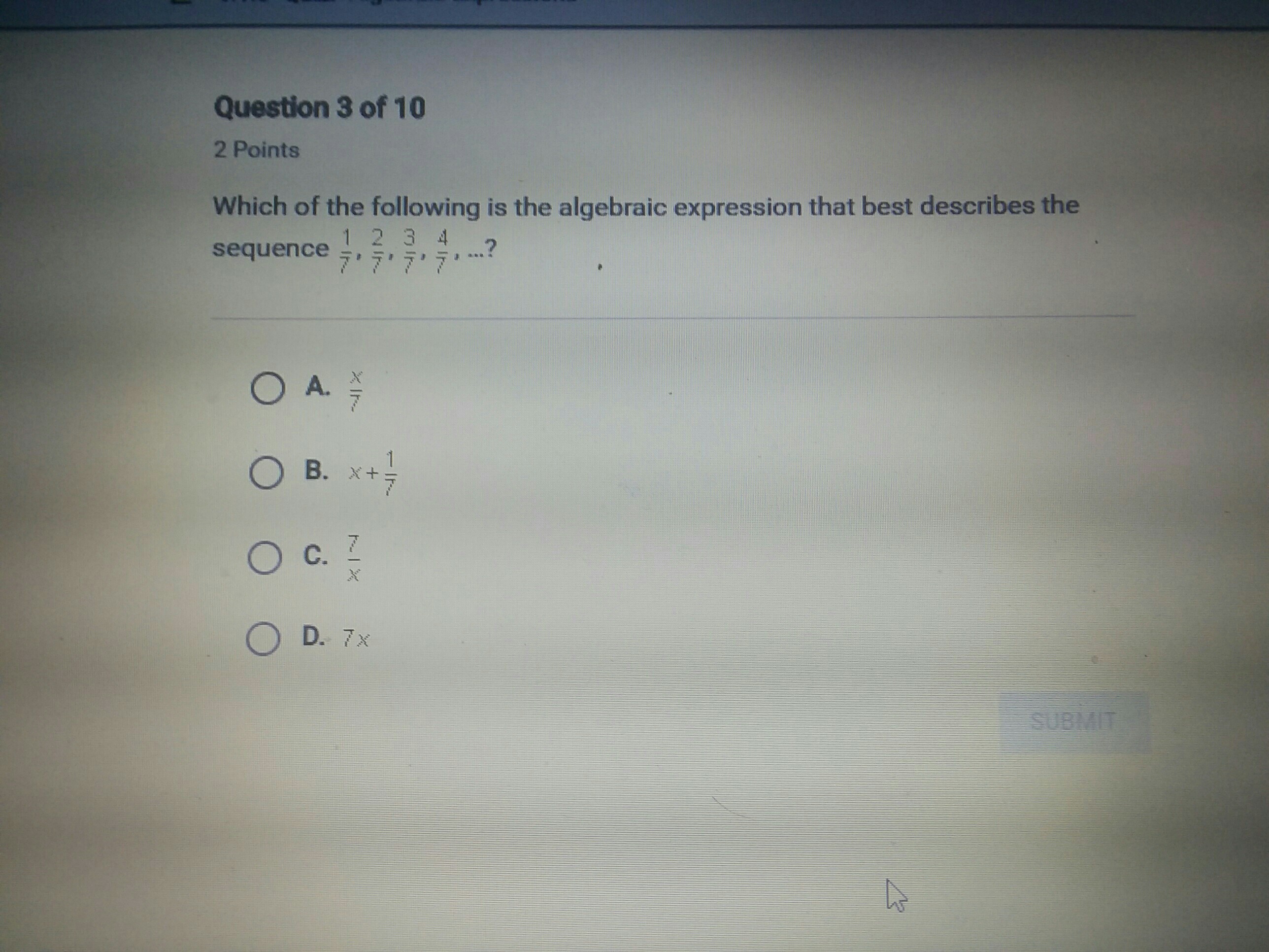 The x^{th} place of the sequence is \frac{x}{7}. Therefore, option (A) is correct.