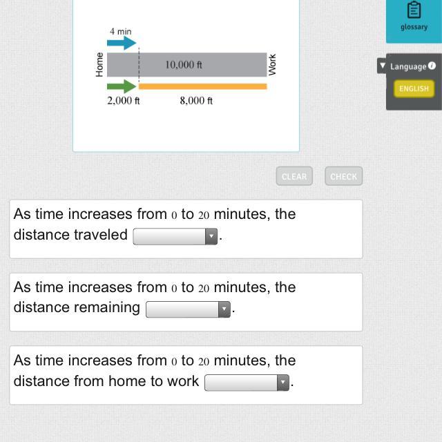 a) As time increases, the distance traveled increases because you are traveling from home to work at a rate of 500 ft/min