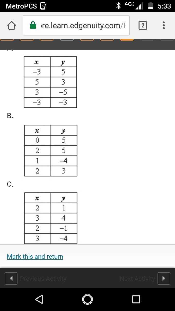 For answer B, x = 2 returns two y-values of 3 and 5, so it cannot be a function.