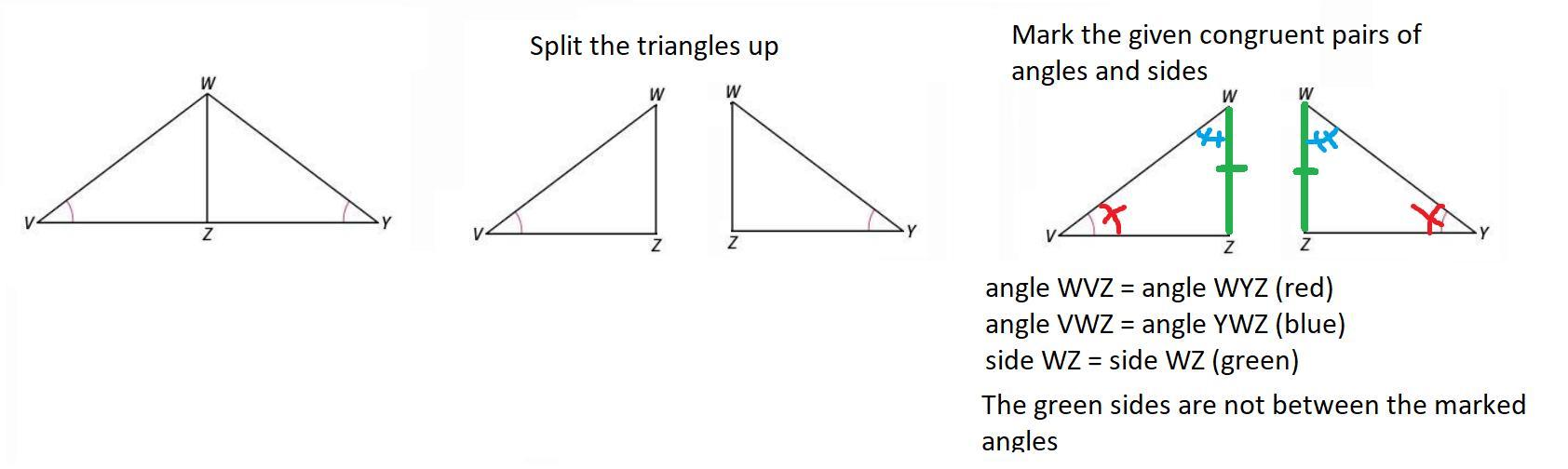 Check out the diagram below. Note how for the left triangle, the side ZW is not between the marked angles V and W. So we do not use ASA and instead go with AAS. The order matters. If for instance, we knew that VW = WY, then we would go with ASA.