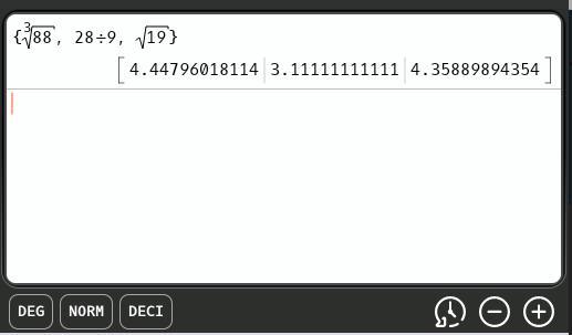 (a)  twenty-eight ninths, square root of nineteen, cube root of eighty-eight