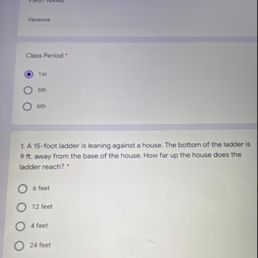 1. We know that the hypotenuse is 15 ft and the base is 9, know we can apply it into the pythagorean theorem