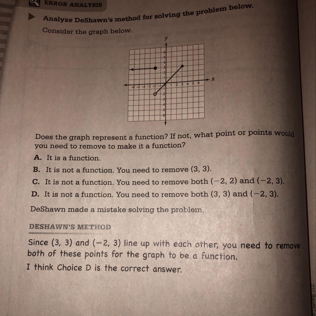 the mistake that deshawn made was that he mixed up the vertical line test with horizontal instead and has deduced that since a horizontal line has intercepted both points, they must be removed.