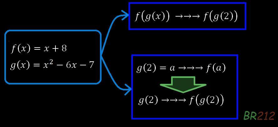 Keywords: Let f(x) = x + 8 and g(x) = x² - 6x - 7, find f(g(2)), composition function, input, f(g(x)), value, initially,