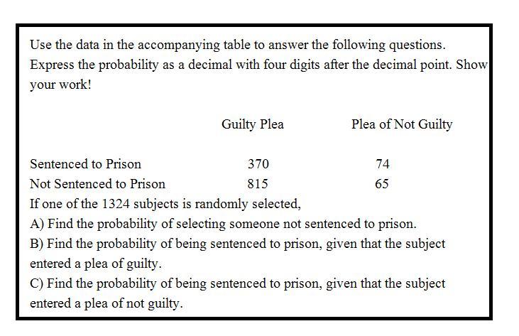 ed a plea of guilty. b) (3 pts)If 2 different study subjects are randomly selected (without replacement), find the probability that they both were sentenced to prison. c) (3 pts)Find the probability of being sentenced to prison, given that the subject entered a plea of guilty. d) (3 pts)Find the probability of being sentenced to prison, given that the subject entered a plea of not guilty.