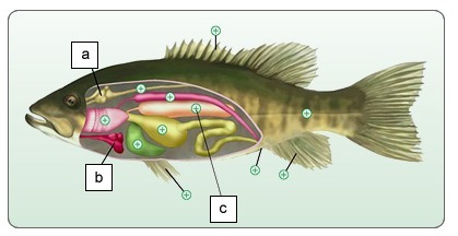 The parts labeled in the diagram are swim bladder, brain, and heart.
