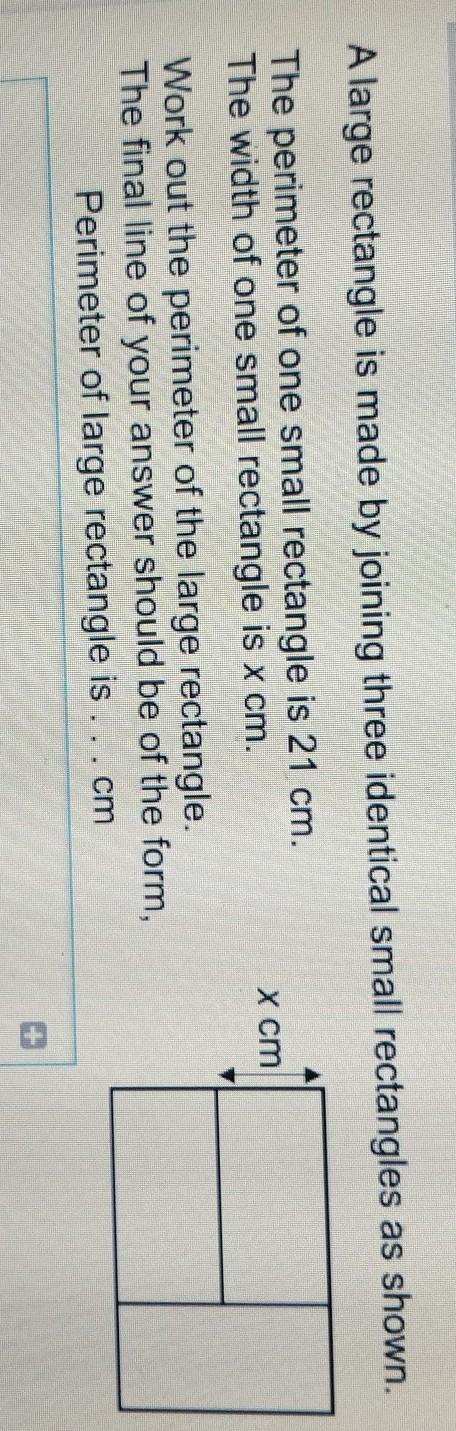The width of one small rectangle is x cm and the length of one small rectangle is 2x cm. Therefore the perimeter of the small rectangle is given as: