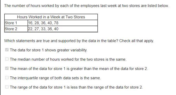 The range on store 1 is 62, but the range for store 2 is only 18. So store 1 has more variability because the numbers are more spread out.