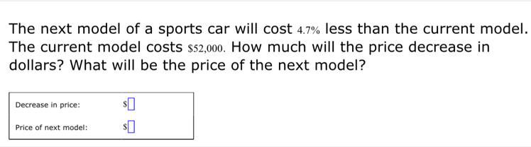 To get the decrease, all you need to do is convert your percent (4.7) to a decimal (4.7 / 100) which is 0.047 and multiply the original price by that (52,000 * 0.047) which is 2,444.