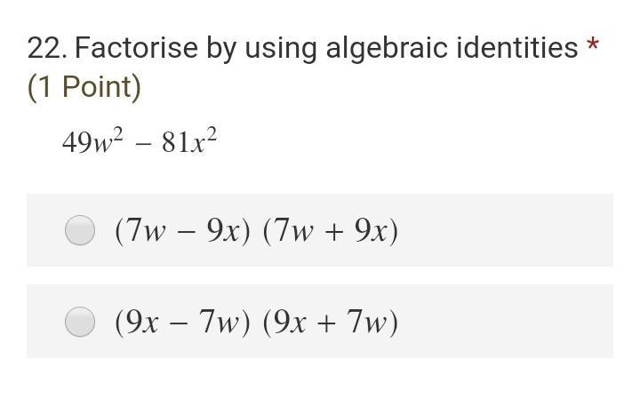 7²w² - 9²x² = (7w + 9x)(7w - 9x)
