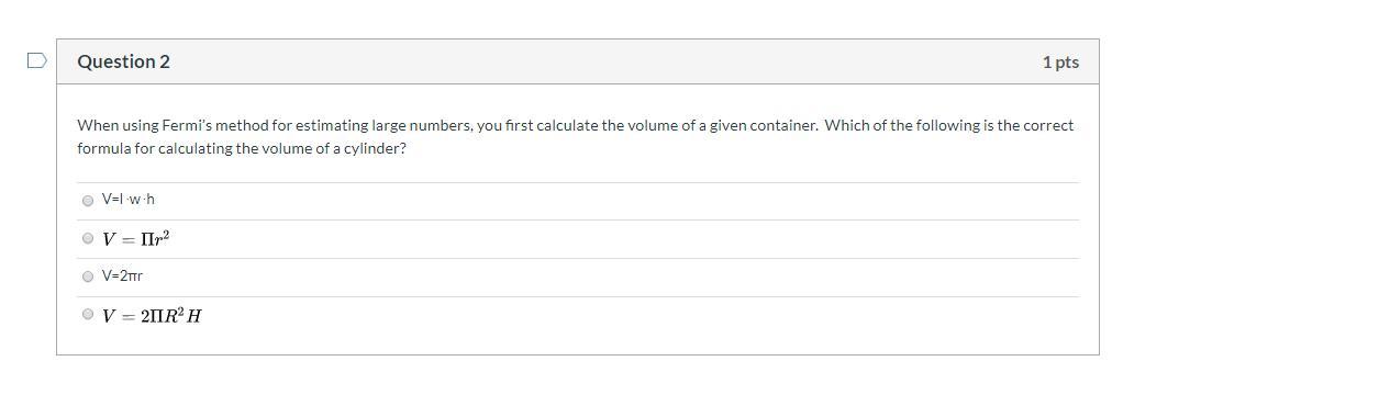 When using Fermi’s method for estimating large numbers, you first calculate the volume of a given container. Therefore, V = 2πR²<em>H </em>is the correct formula for calculating the volume of a cylinder.