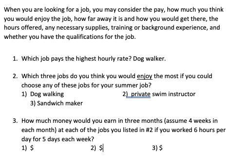 3.) How much money would you earn in three months (assume 4 weeks in each month) at each of the jobs you listed in #2 if you worked 6 hours per day for 5 days each week?