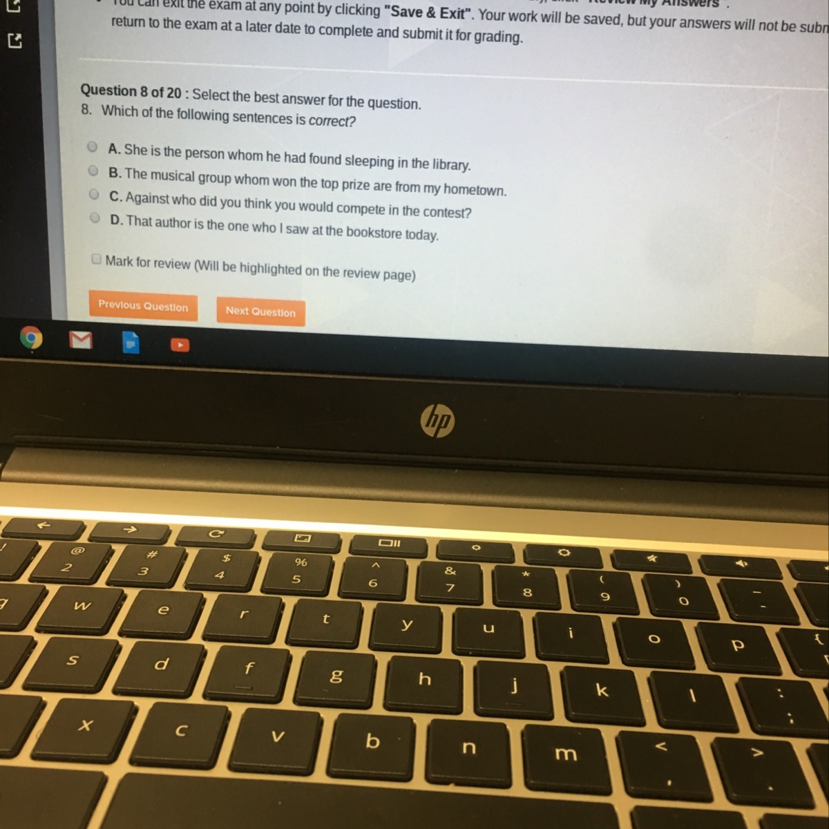 The same with the option D, that author is the one who I saw at the bookstore today, in this sentence, the relative pronoun should be used in this sentence is <em>“whom” </em>instead of <em>“who”</em> because it substitutes the direct object of a verb or preposition.