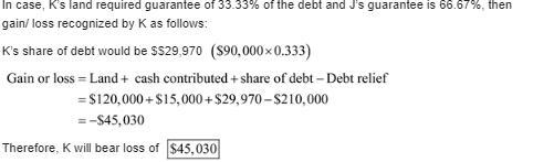 This $45,003 will be a loss because the nonrecourse debt of $210,000 is more than Kevin's total money from land, contributed cash and share of guarantee loan.