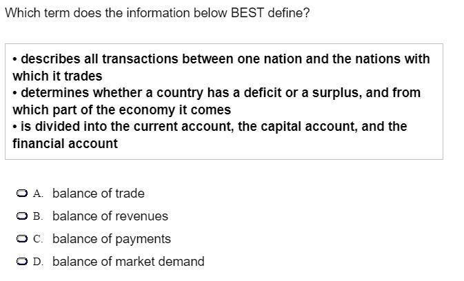 According to this, the information best defines the balance of payments because only this balance includes the current, capital, and financial account. Also, this is based on transactions and trade and shows the deficit or surplus of a country.