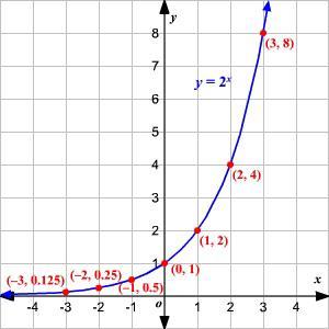 A simple exponential function to graph is y=2x . Notice that the graph has the x -axis as an asymptote on the left, and increases very fast on the right. Changing the base changes the shape of the graph. Replacing x with −x reflects the graph across the y -axis; replacing y with −y reflects it across the x -axis