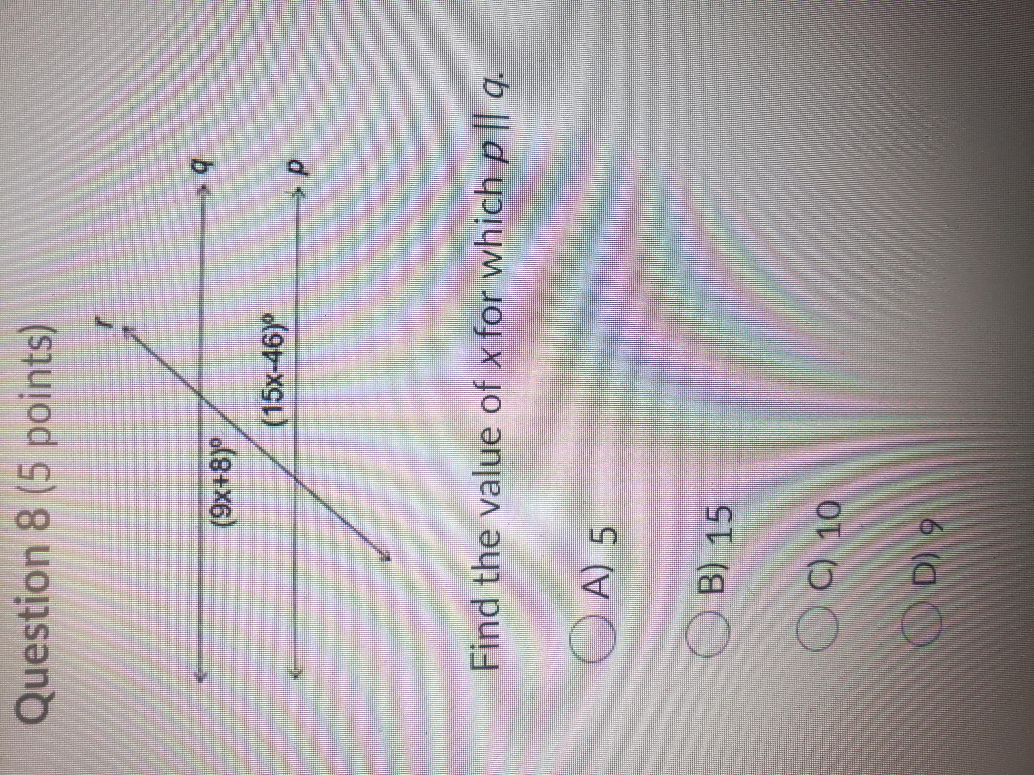 This is because you have to first make the equations equal to each other. You do this because you can see that the angles are equal to each other meaning that they are the same amount of degrees. So the equation you will have is (9x + 8) = (15x - 46).